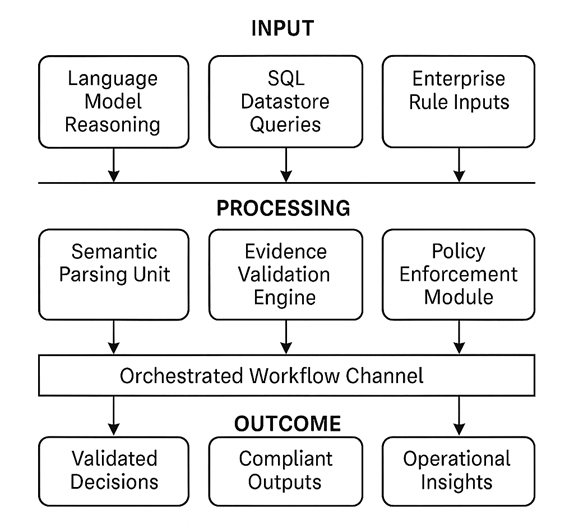 model reasoning, SQL based factual validation, and rule governed decision