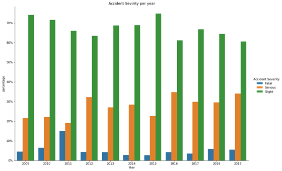 Data concerning road traffic accidents involving young drivers in Israel from 2009 to 2019 are presented in (Figures 1 and 2). While the rates of fatalities and severe injuries do not seem to have shown an upward trend over time, their absolute levels are high. This underscores the importance of addressing safety concerns and risks associated with young drivers within the transportation system. Numerous studies have attempted to address these concerns and uncover the determinants of severe injuries in young drivers. These factors encompass demographic characteristics (e.g., age and gender), alcohol involvement type of collision, environmental conditions, road features, location, time of day and road illumination.