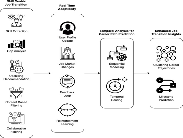 The proposed framework presents a hybrid machine learning-driven solution for personalized career pathway recommendations. It integrates multiple components, including skill-centric filtering, real-time adaptability and temporal analysis, to deliver dynamic and forward-looking guidance. By combining these elements, the framework ensures that users receive not only immediate job recommendations but also proactive suggestions for long-term career planning.
