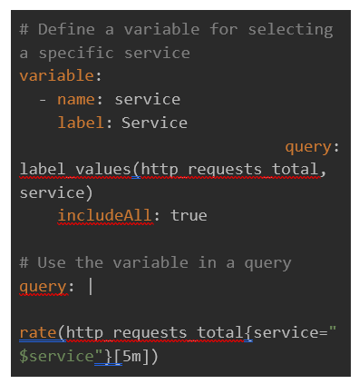 ● Enhanced Flexibility: Variables can be used to change the data displayed on dashboards dynamically. You can switch between different services, environments or metrics without creating separate dashboards for each context.