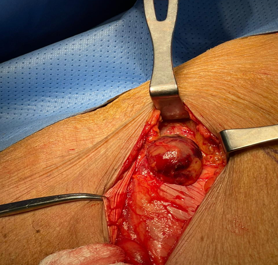 showed intact external oblique fascia with a herniated bowel underneath the