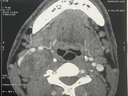 showed irregular peripheral enhancement. Carotid artery angiography was