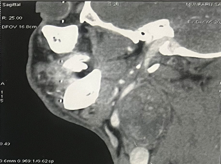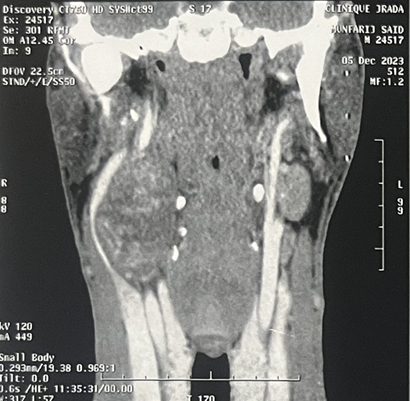 Figure 1: CT imaging of a vagal schwannoma (red arrow) on the right