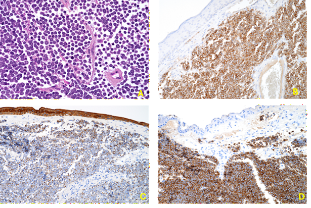 The histological analysis of a 2.5 cm skin biopsy, stained with hematoxylin and eosin, revealed an ulcerated epidermis. The superficial and deep dermis were extensively infiltrated by poorly differentiated neoplastic cells arranged in a solid growth pattern.