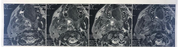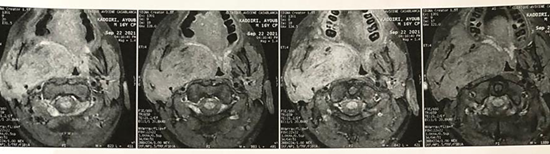 showing the tumor that infiltrates the right parotid, the right parapharyngeal