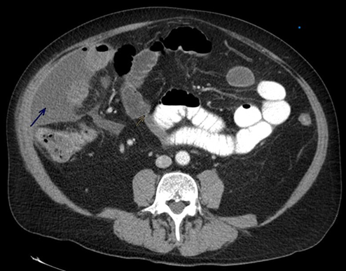Abdomen with contrast. Blue Arrow pointing to layering free fluid foci with