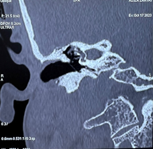 Figure 4: ct scan of the temporal bone in coronal and axial cuts: showing soft tissue density within the right middle ear cavity, pedicle tissue formation opposite the jacobson nerve, ossicular lysis, fistula between the upper semicircular canal and the tympanic cavity.