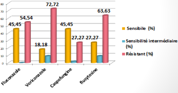 Sensitivity to antifungal agents revealed resistance to fluconazole and flucytosine and particularly to voriconazole, with a 72% resistance rate, compared with only 18% sensitivity. Caspofungin, on the other hand, showed a better balance between sensitivity and resistance, with almost half the strains being sensitive, i.e. a rate of 45.45%.