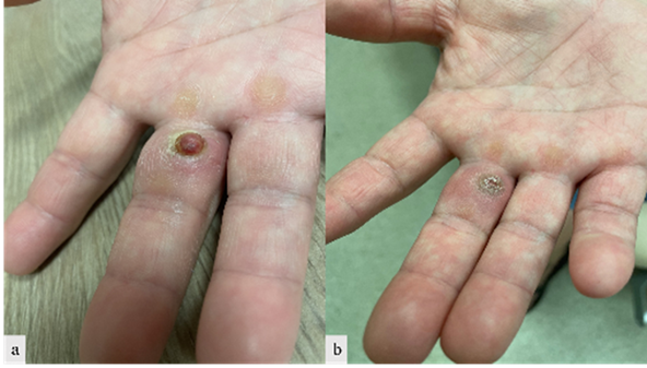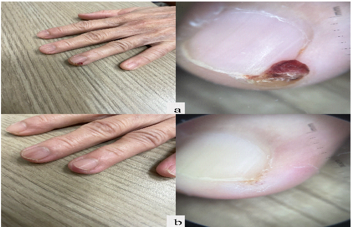 50-year-old male with a right index finger PG who showed NR at 4 weeks. |