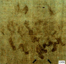 Fourth test: red stains produced by grains of natural myrrh interposed between
