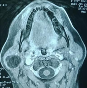 resonance imaging (MRI), a 31x26x30 mm oval-shaped lesion with well-defined