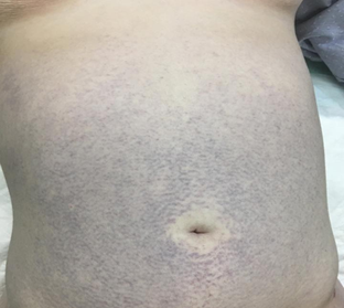 signs were normal. On physical exam, blue discoloration of the abdomen was noticed (figure 1).