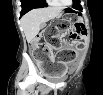 with oral and intravenous contrast demonstrated a dilated obstructed large