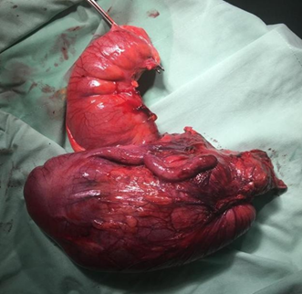 operating room for an exploratory laparotomy. The abdominal skin was bluish in color. Upon entering the abdomen, the small