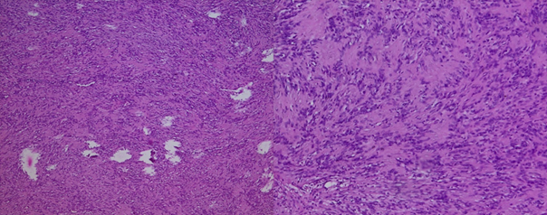 tumor (×20 and ×40 magnification) revealed cytological bland spindle cells with