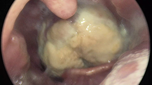 membrane. Indirect laryngoscopy showed a sizable mass towering above the