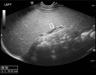 Ultrasound scan. Longitudinal image through the left hypochondrium shows