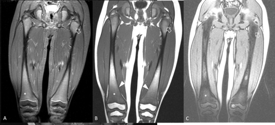 2). Lower femoral MRI revealed abnormal bone marrow signal for age with