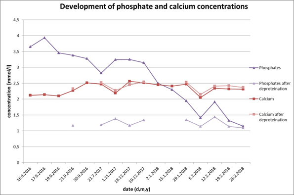 Figure 1. The phosphate and calcium concentrations before and after deproteination. While the calcium concentration remains the same after the deproteination, the concentrations of phosphate decrease after the deproteination. There is a significant drop in untreated serum phosphate concentrations during the time caused by treatment of monoclonal gammopathy.