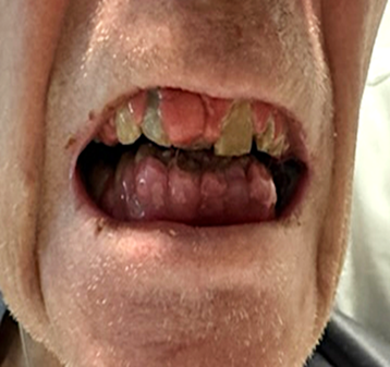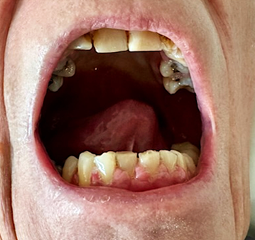 hypertrophy encasing most of his teeth (Panel A), severely limiting oral intake