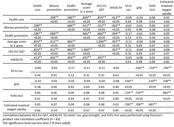 Methods: eighty-two subjects who consented to the study were included in the study, and hls-eu-q47, ehealth, physical composition and physical fitness (10 m run, grip strength, yoyo test) were measured.