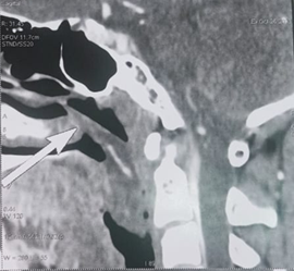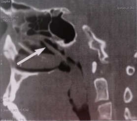 Figure 2. Axial and sagittal sections of a CT scan of the face: shows a mass of cystic density which is inserted into the middle turbinate and extends into the nasopharynx (a,b) and oropharynx (a,b,c).
