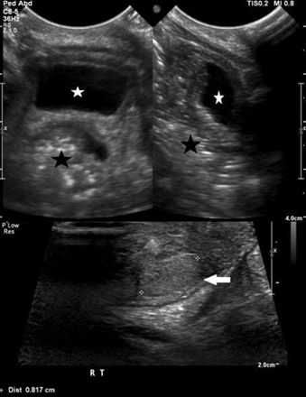 Establishing the diagnosis of 5-α-reductase deficiency is often suggested by an elevated plasma testosterone (t), to dihydrotestosterone (dht) ratio following human chorionic gonadotropin hormone (hcg) stimulation8-10. Genetic studies can confirm the diagnosis11-16. Imaging diagnostic studies with ultrasonography (us) and/or magnetic resonance (mr) will help in elucidating the internal structures. In all patients no female internal organs were demonstrated, however, all were found to have testes in variable positions (abdomen, inguinal canal and scrotum)17-24.