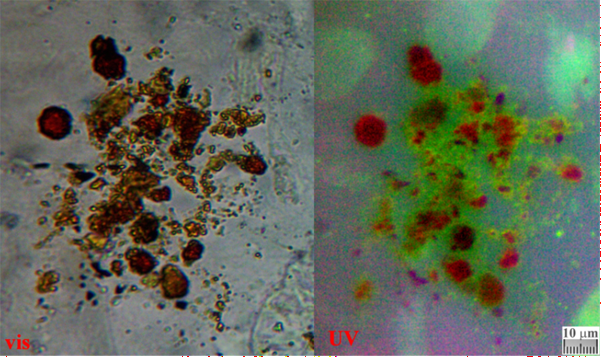the left, visible epi-illumination on bright field; on the right, the UV