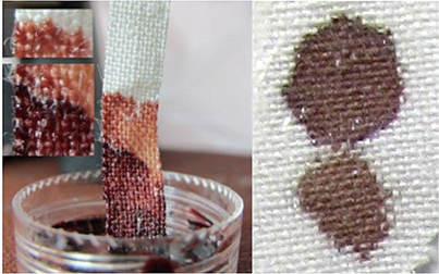 Figure 4: on the left, bloodstains from ts on the forehead. On the right, a fresh bloodstain soaked in a linen cloth imbibed in a liquid mixture of myrrh and urea shows a clear area in the center as evident in the photo of ts on the left.