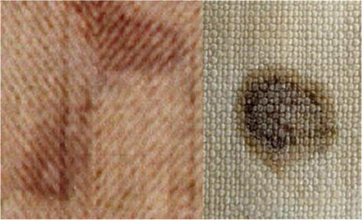 well-defined bloodstain edges are shown on the left on a strip of linen fabric