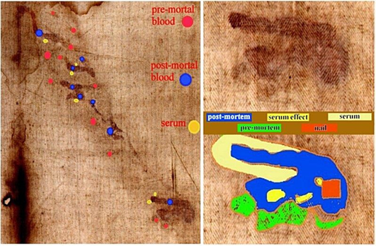 Keywords: turn shroud; bloodstains; erythrocytes; fibrin; urea; beta-activity; fluorescence; hemopericardium; rigor mortis; putrefaction; body image; resurrection; dogma