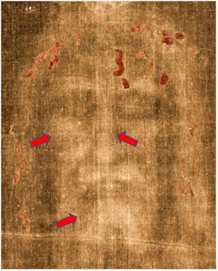 Numerous bloodstains1-4,27-31 scattered throughout the double body image of the ts show evidence that jesus was tortured39: there are blood marks all over the body image consistent with pre-crucifixion flagellation, blood marks on the head consistent with a “crown” of thorns, blood marks on the hand and feet consistent with crucifixion and the blood on the chest that evidences a post-mortem wound typical of a spear. All these tortures received by jesus christ are synthetically described in the chb.