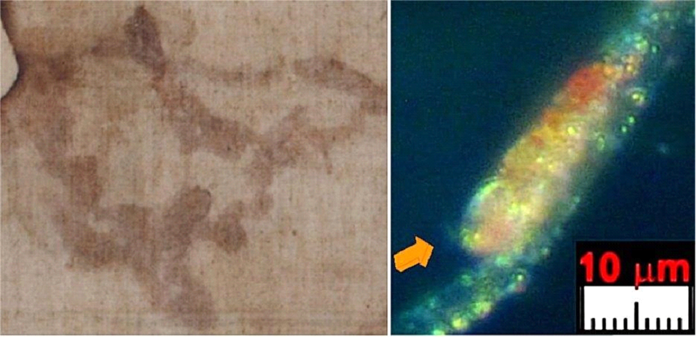 In sharp contrast, analyzing the same samples collected by sturp and studied by heller and adler, w. Mccrone32-38 detected no blood whatsoever on the ts, but instead, he identified very small-sized red pigments (like red ochre and vermillion) which he referred to as “sub-micron particles.” Strangely, a famous microscopist like mccrone did not also consider the particles mentioned above already identified in ref.25 which, according to the author, are also very preponderant27. Adds other information about the blood features on the ts, also discussing their still reddish color, opposite to the common dark brown color of the old blood.