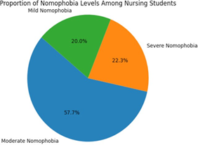 distribution of nomophobia levels among nursing students. The largest segment represents moderate nomophobia (57.69%),