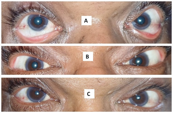 Figure 1: Showing pupillary appearance Mydriasis on day 1(A), day 2(B), normal on day 3(C).