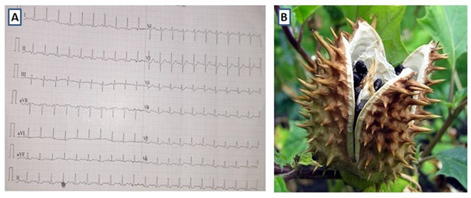 Figure 2: A) showing electrocardiogram showing sinus tachycardia (heart rate 124/minute) B) Datura plant with fruit and seeds.